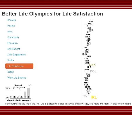 The Olympics are all about universality and humanity, opposing nations in sport while uniting people throughout the world. The three Olympic values, of “excellence”, “friendship” and “respect” underline the universal appeal of the Olympic Movement. His Majesty Jigme Singye Wangchuck King of Bhutan, when outlining his vision of “Gross National Happiness”, referred to similar ideals: “As citizens of the world, our unifying force, our strength must come from something that is not bound by nation, ethnicity or religion – from fundamental human values. Values shape the future of humanity.” How do we reconcile these ideals with everyday life concerns?If asked about the Olympics, Londoners are more likely to raise more mundane concerns, revolving around overcrowded streets and the difficulty of obtaining tickets for their favourite sporting event. So can we say citizens around the world unite in their definition of happiness and do their priorities coincide? Well not really, to judge by people’s choices when building their own Better Life Index.
