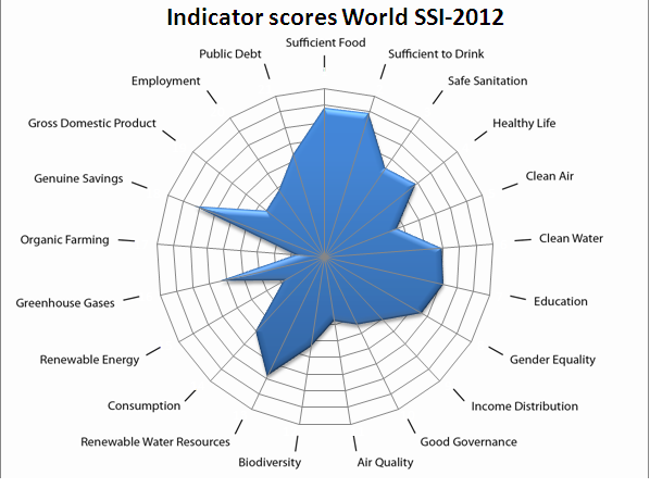 The Sustainable Society Index, SSI (www.ssfindex.com), has been developed to measure sustainability, or if you prefer to say so, wellbeing which will remain, which is sustainable. The SSI explicitly includes all three dimensions of wellbeing. It is built up by only 21 indicators. So it is an easy and transparent tool, balancing between the need of information for policy purposes and the necessity to give a clear message to the public at large. The calculations of the SSI cover 151 countries, comprising no less than over 99% of the world population.
